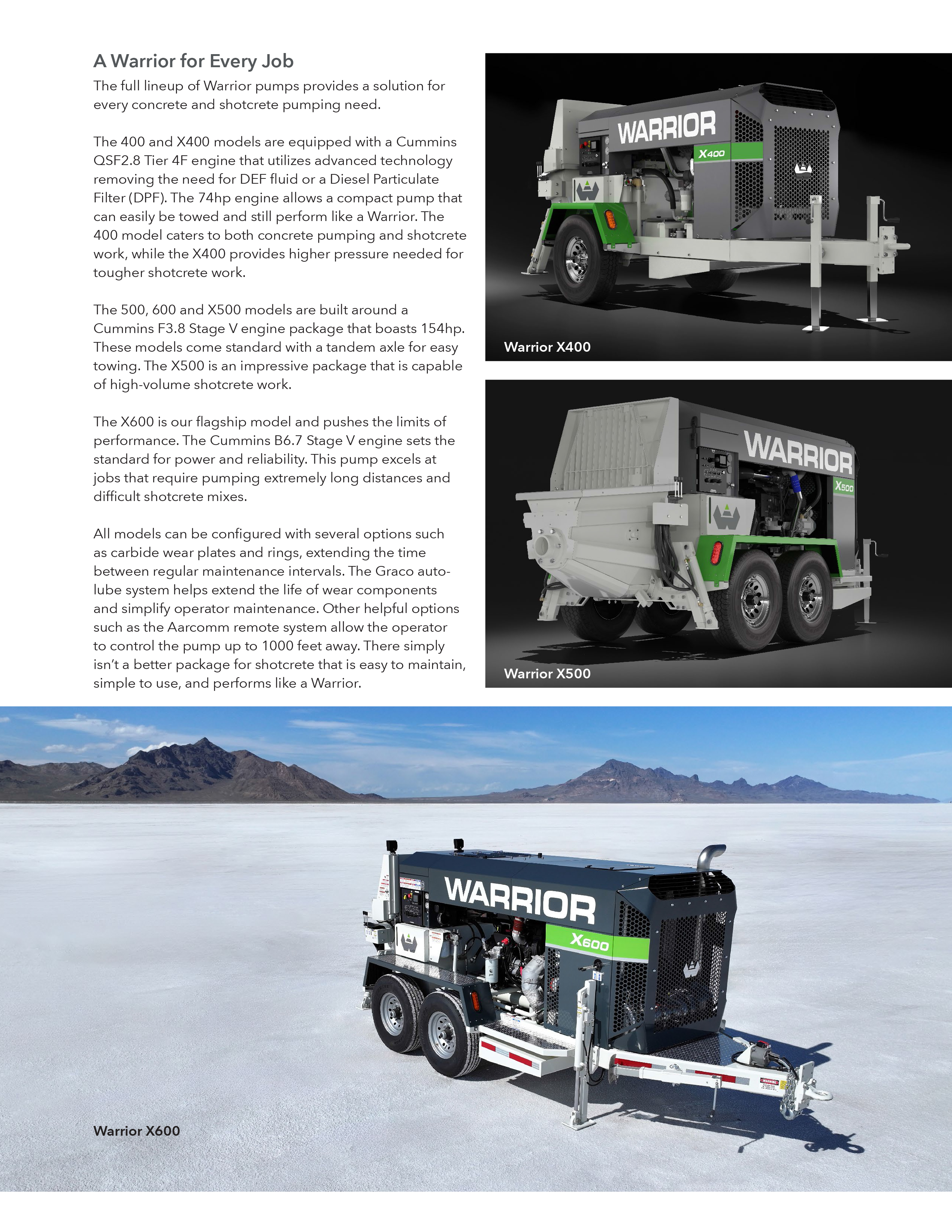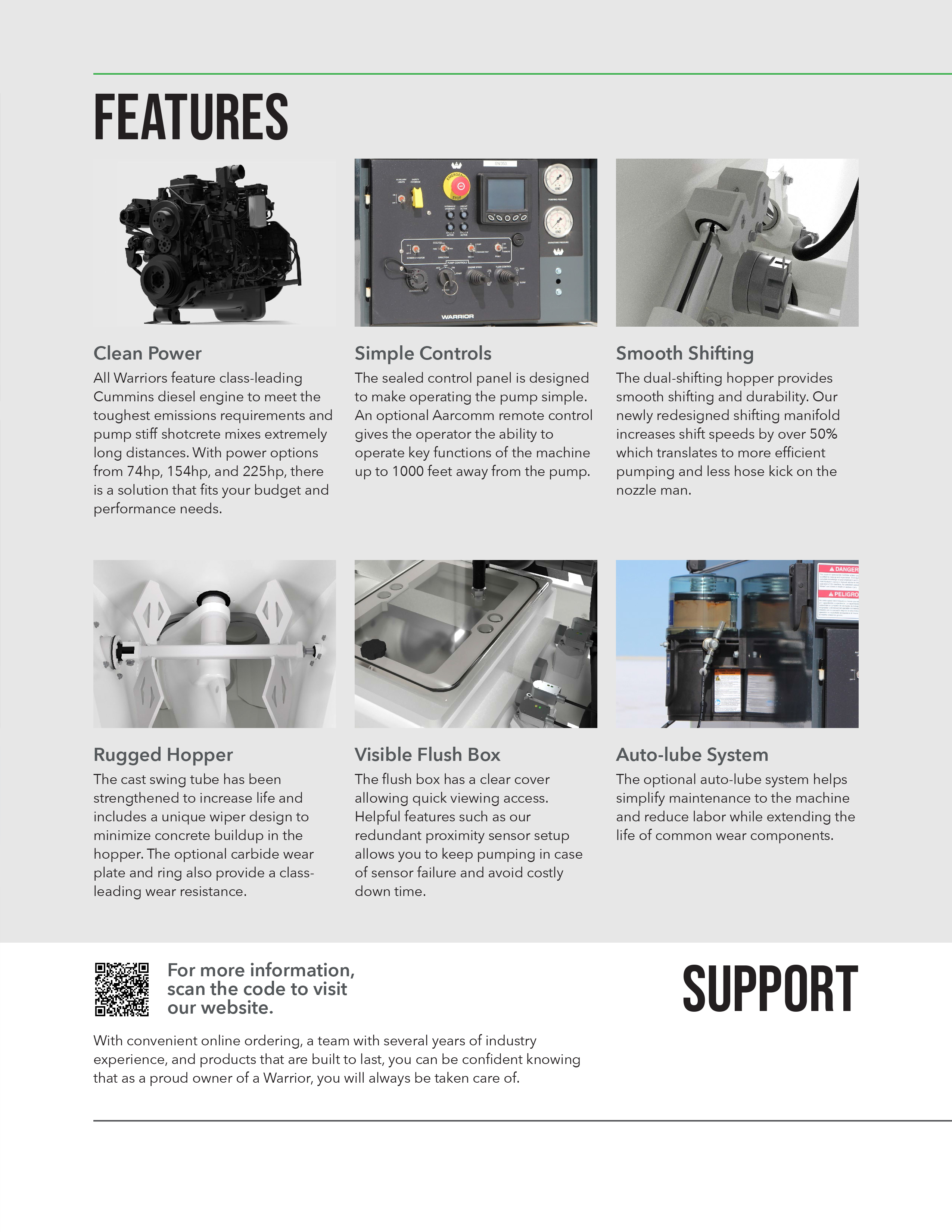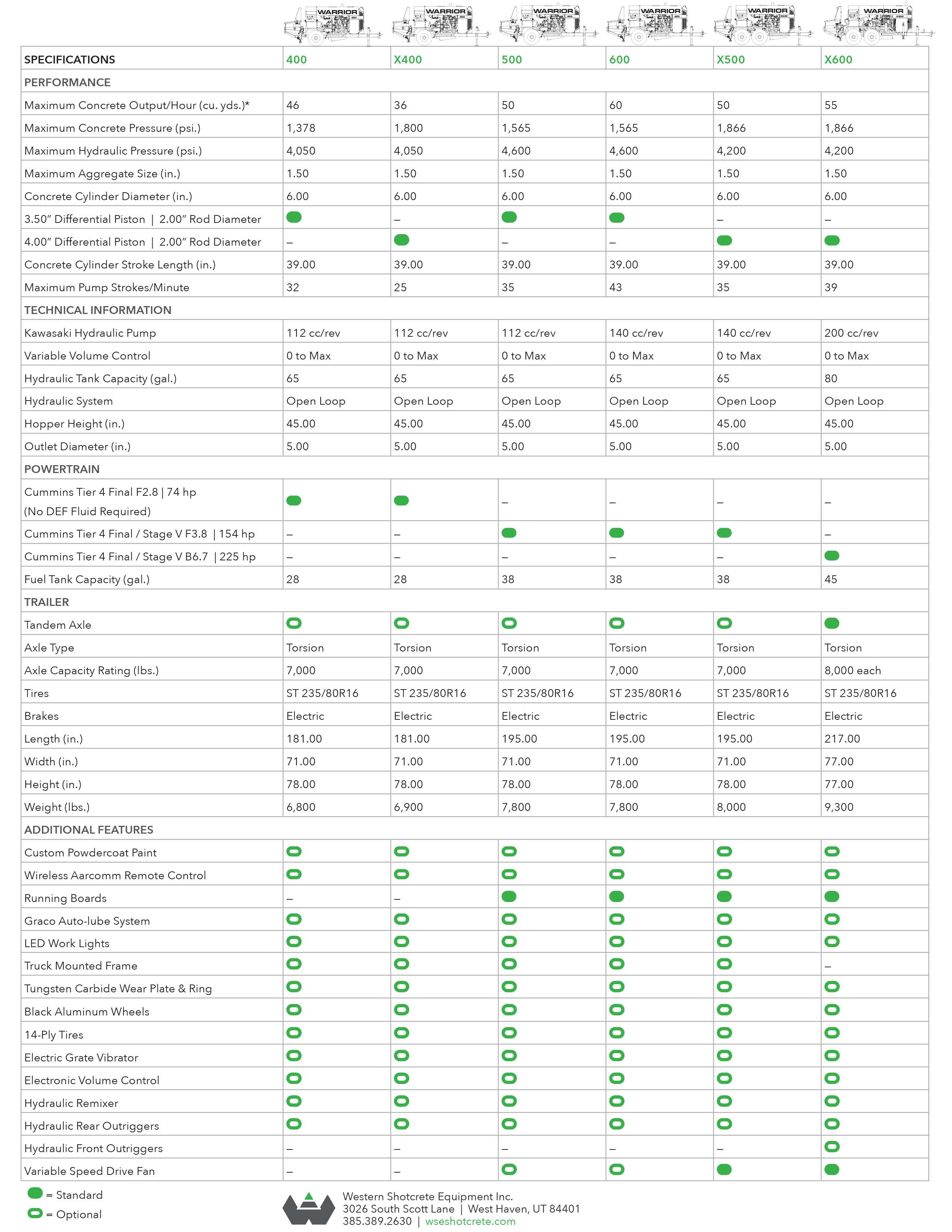 The Warrior 400 is a robust and reliable concrete pump designed for solid mid-range performance on demanding job sites. Delivering a maximum concrete output of 50 cubic yards per hour and a concrete pressure of 1,378 psi, it handles aggregate up to 1.5 inches with ease. Powered by a Cummins Tier 4 Final F2.8 engine generating 74 horsepower—without the need for DEF fluid—it combines efficiency with minimal maintenance. The hydraulic system runs on an open loop with a 112 cc/rev Kawasaki pump and a 65-gallon tank, while the 6-inch diameter concrete cylinders deliver up to 32 pump strokes per minute. Weighing in at 6,800 pounds, the Warrior 400 sits on a torsion tandem axle trailer rated for 7,000 lbs per axle, and includes 14-ply ST 235/80R16 tires with electric brakes. Standard features like LED work lights, wireless Aarcomm remote control, and a tungsten carbide wear plate and ring make it a dependable, operator-friendly machine ideal for shotcrete and concrete pumping applications.